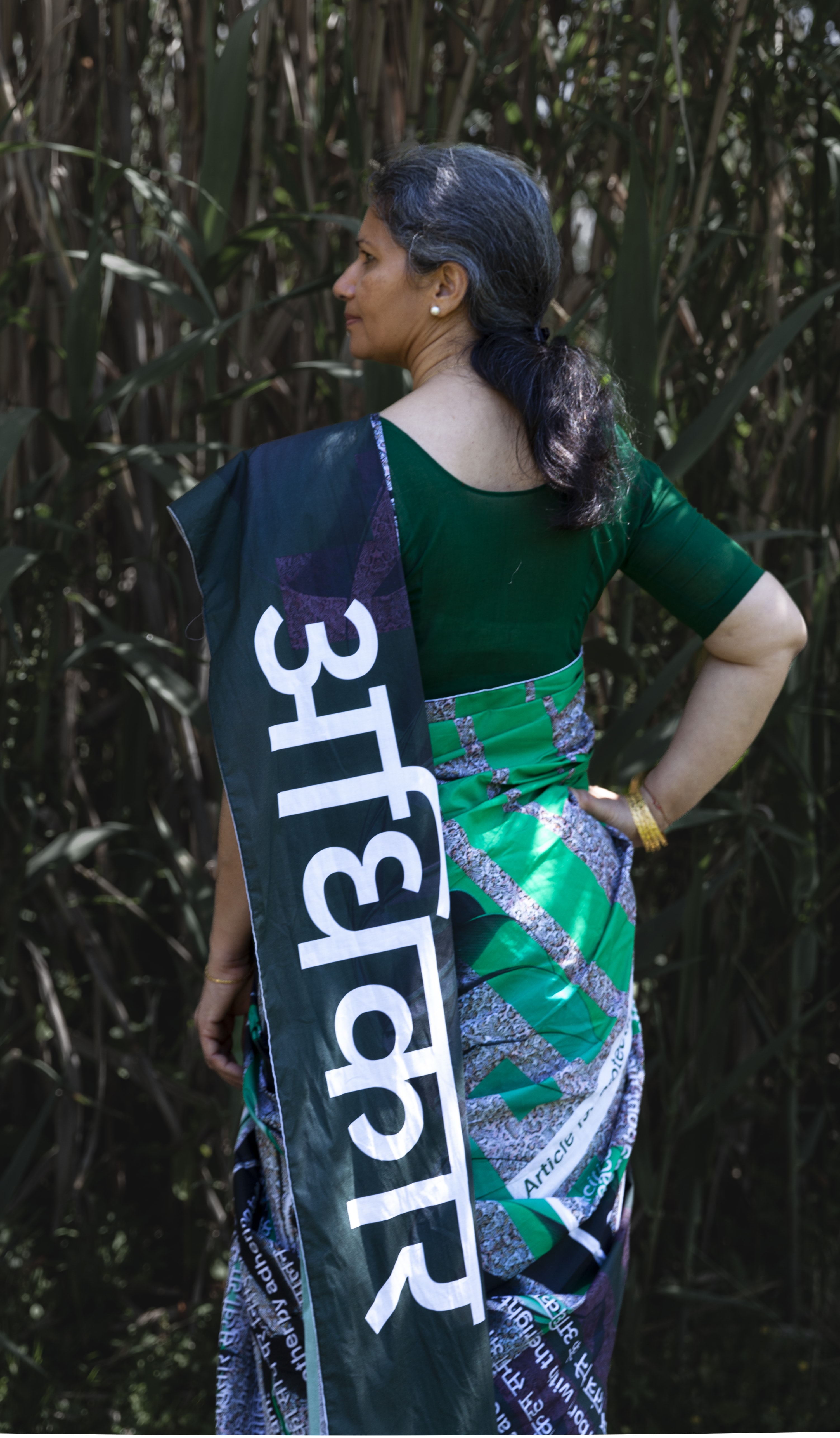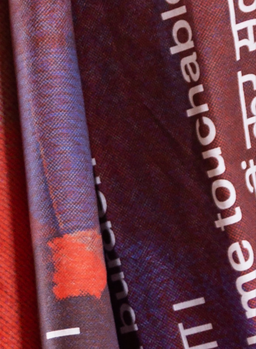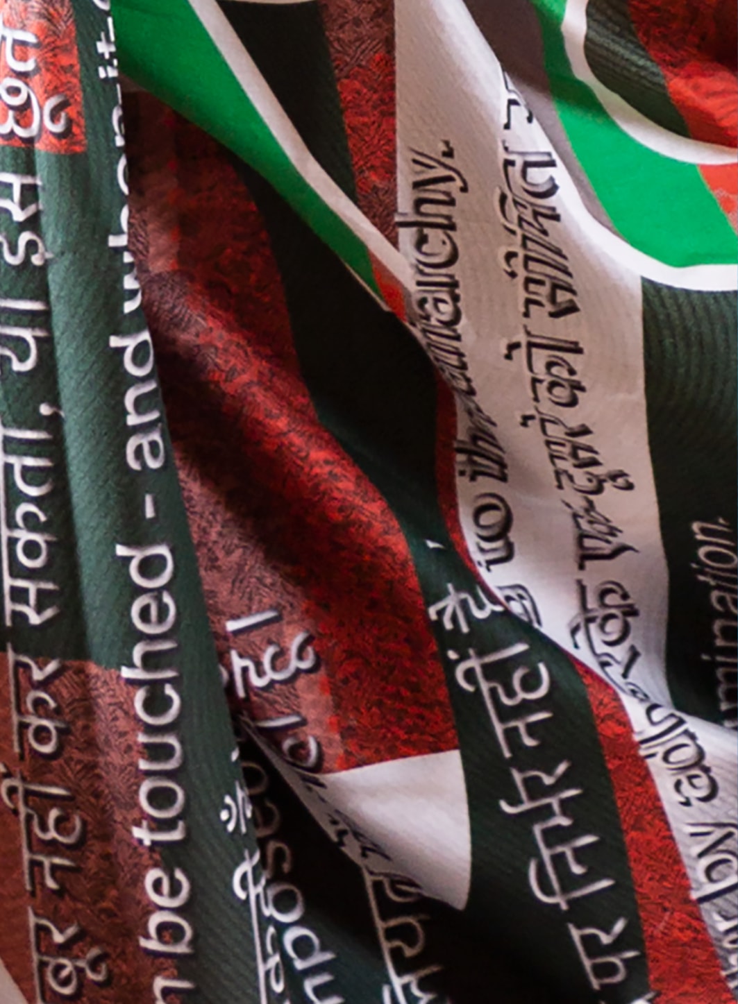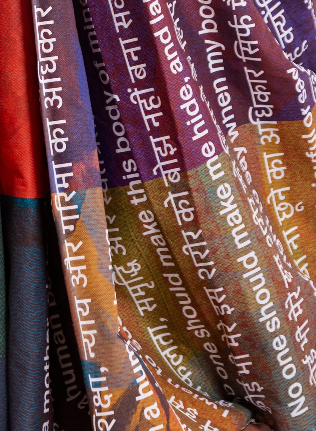 So on the top left corner in the title of the saree. The bottom left is the whole series project name. In the centre a non-rhyming poem about the caste system. Then on the bottom right in English and Hindi a single word expressing a word taken from anti-caste manifestations. and finally above that laws from the Indian constitution reminding the illegality of such a system, in English and then on top in Hindi. The positioning of these elements were very important and calculated so that we could see the poem and words most importantly. The rest is secondary so it is seen if the person wearing the saree unfolds it in a certain way. Also to be noted as the saree has many folds, the poem was written in a structure that each phrase or sentence is independent from the poem as a whole so depending on the way the saree is worn and the height of the person these elements can move differently so we see different parts of the poem.