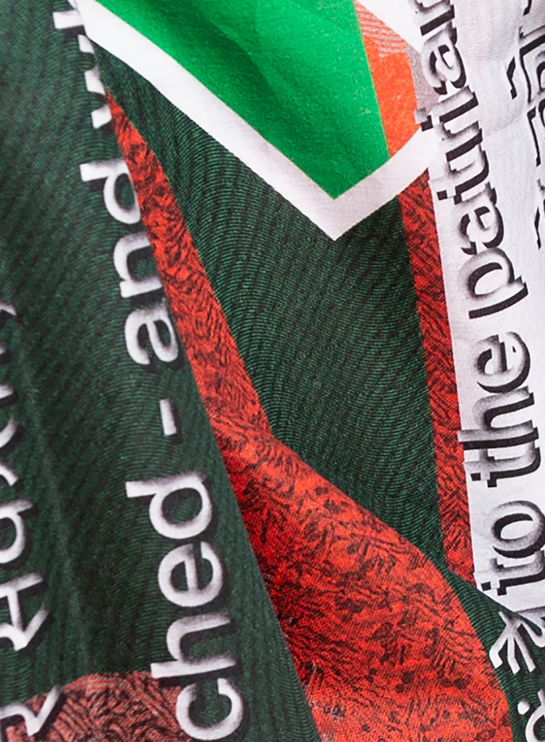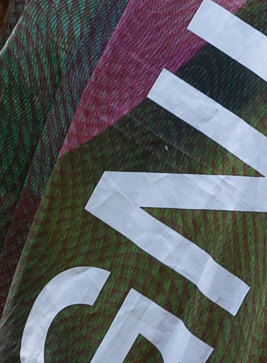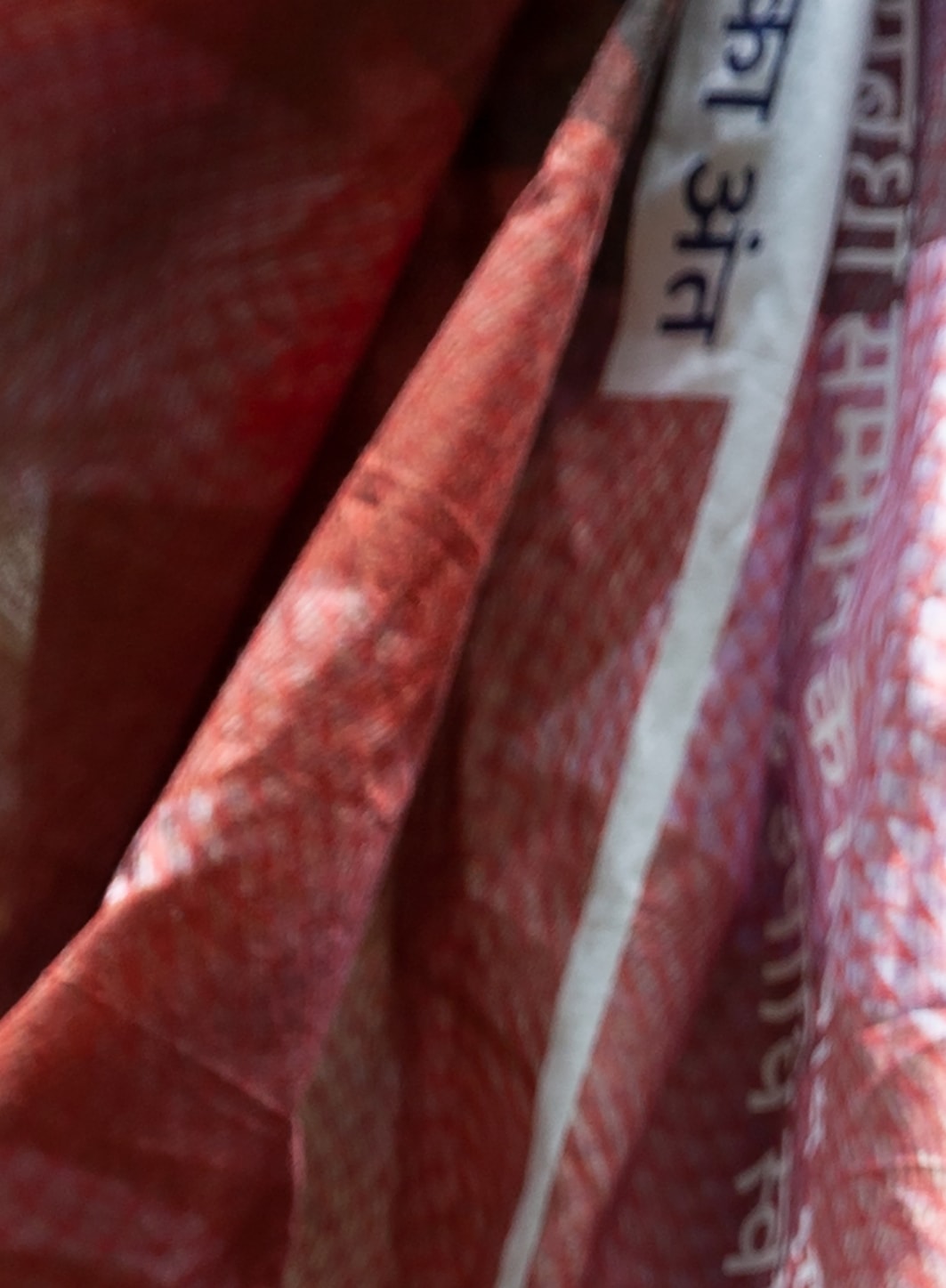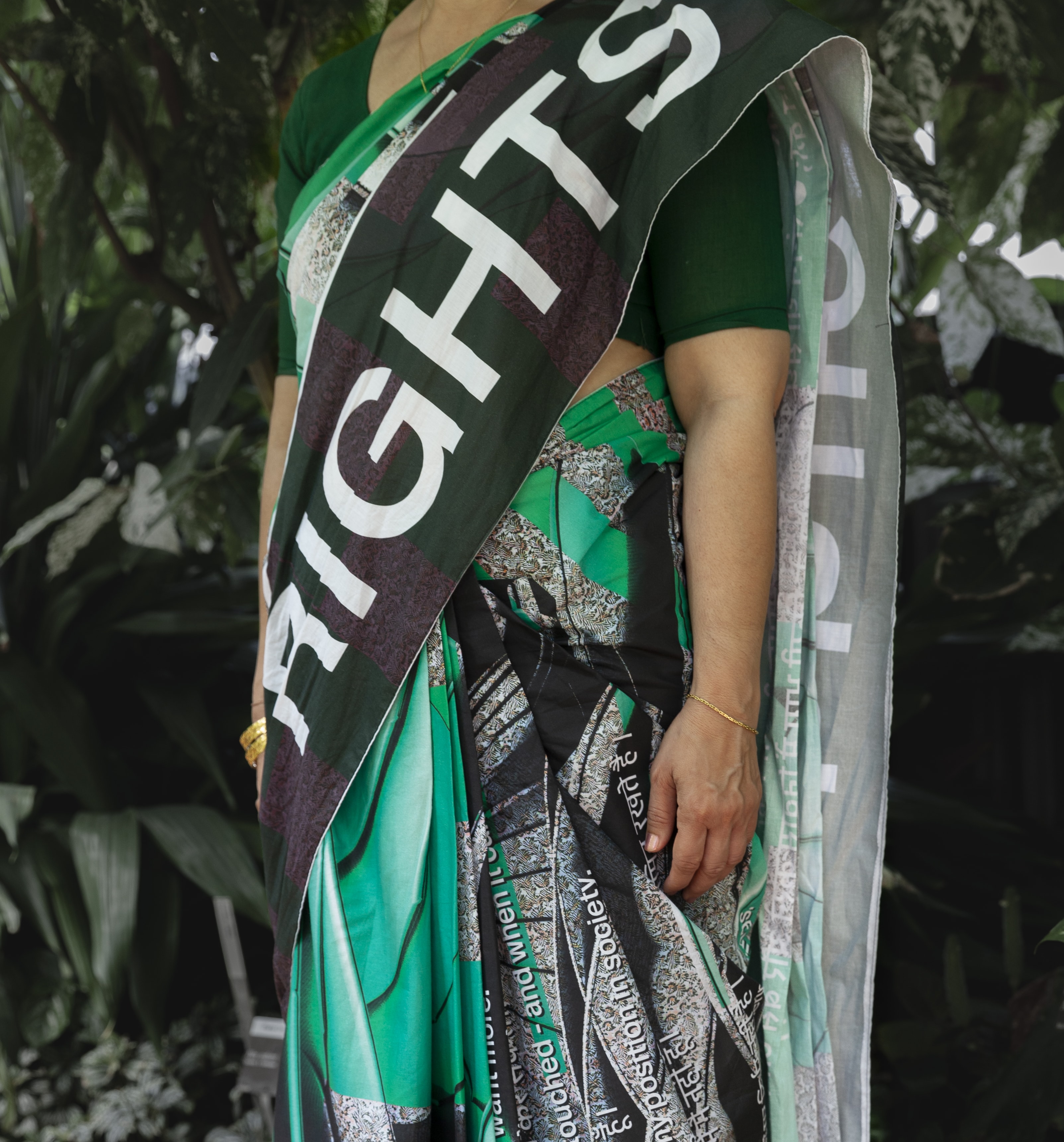 So on the top left corner in the title of the saree. The bottom left is the whole series project name. In the centre a non-rhyming poem about the caste system. Then on the bottom right in English and Hindi a single word expressing a word taken from anti-caste manifestations. and finally above that laws from the Indian constitution reminding the illegality of such a system, in English and then on top in Hindi. The positioning of these elements were very important and calculated so that we could see the poem and words most importantly. The rest is secondary so it is seen if the person wearing the saree unfolds it in a certain way. Also to be noted as the saree has many folds, the poem was written in a structure that each phrase or sentence is independent from the poem as a whole so depending on the way the saree is worn and the height of the person these elements can move differently so we see different parts of the poem.
