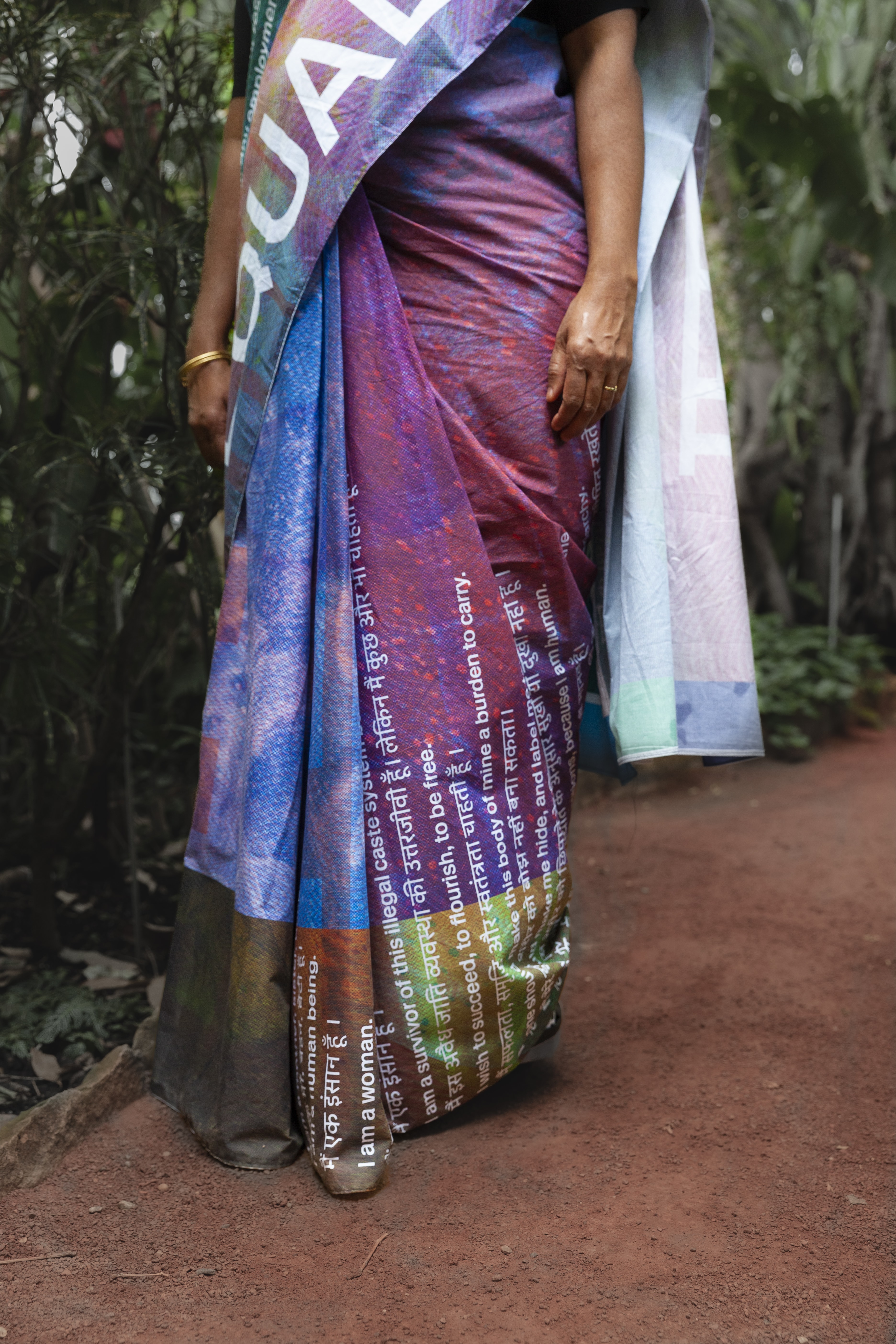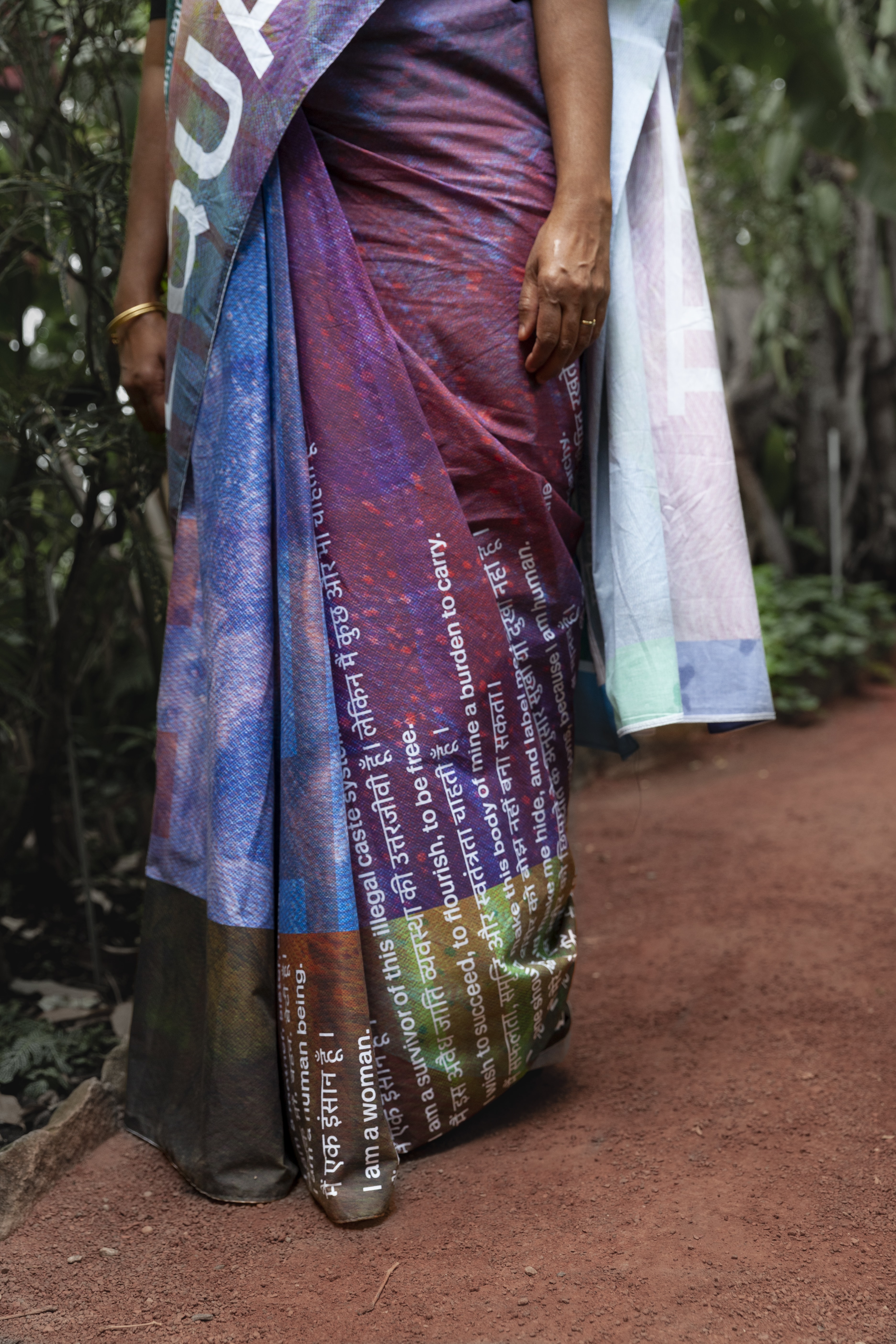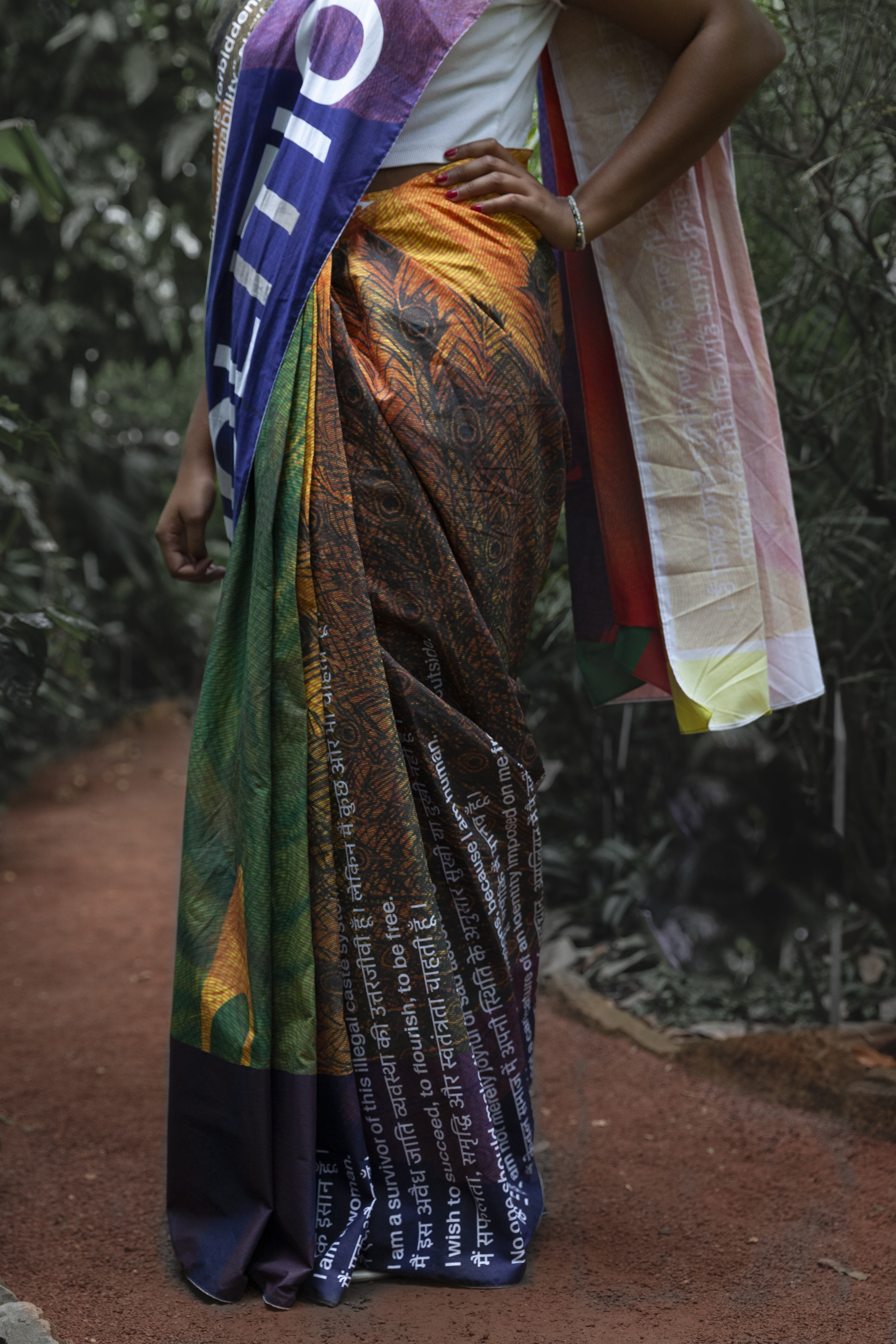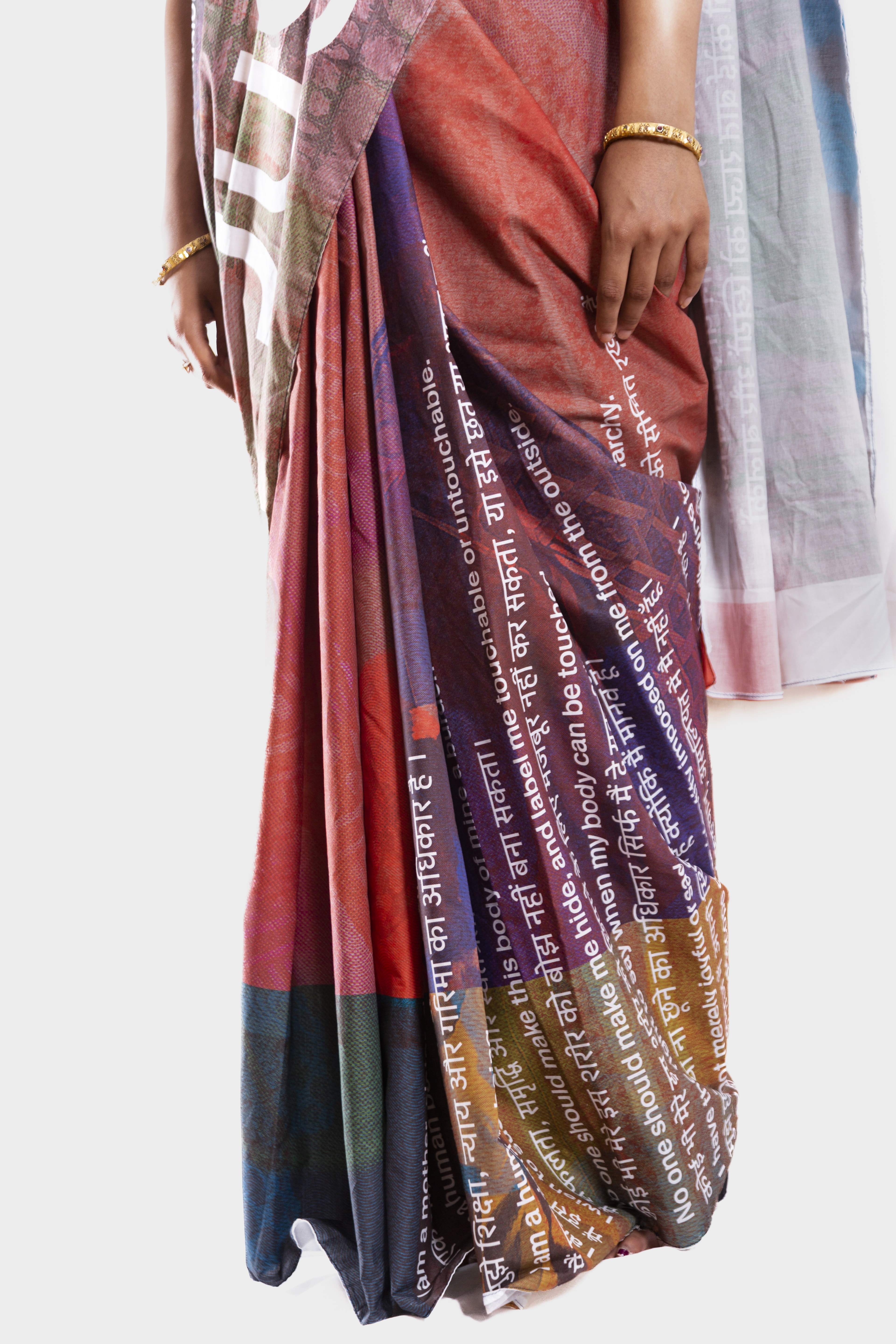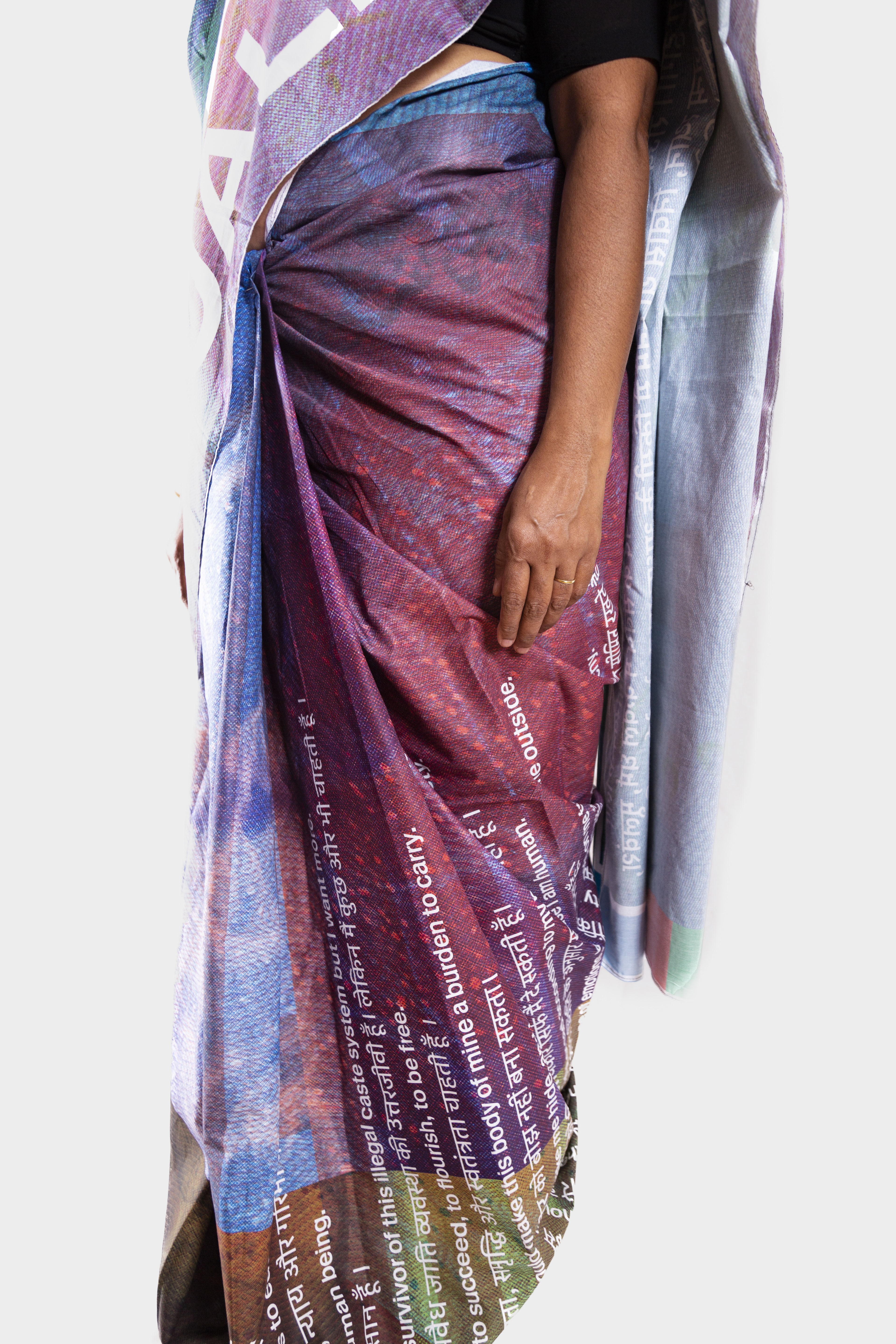 Although the caste system affects both men and women, as a designer I had to make a choice as to which of these to represent. Choosing the sari is my way of bringing the message to the people, and considering India is a male-dominated society in which gender bias is very present, empowering victims or survivors of the caste system and empowering women at the same time seemed like the right way to tackle the problem, in which the patriarchy plays a major part. In such a multilayered society women are at this vulnerable crossover point of both categories that are gender and caste, and although they are considered untouchable are still victims of rape. So empowering them through this piece of cloth felt like the right direction.