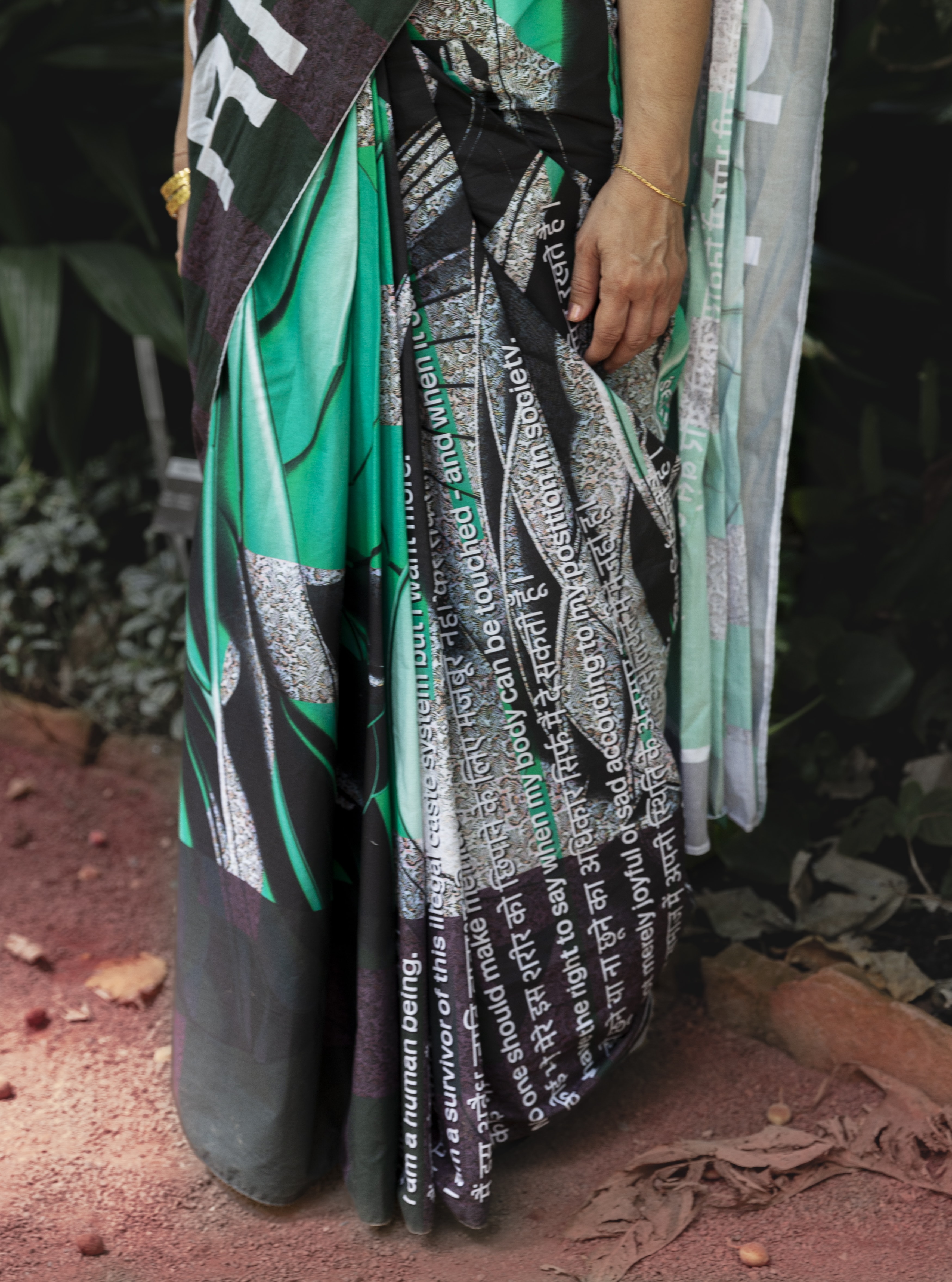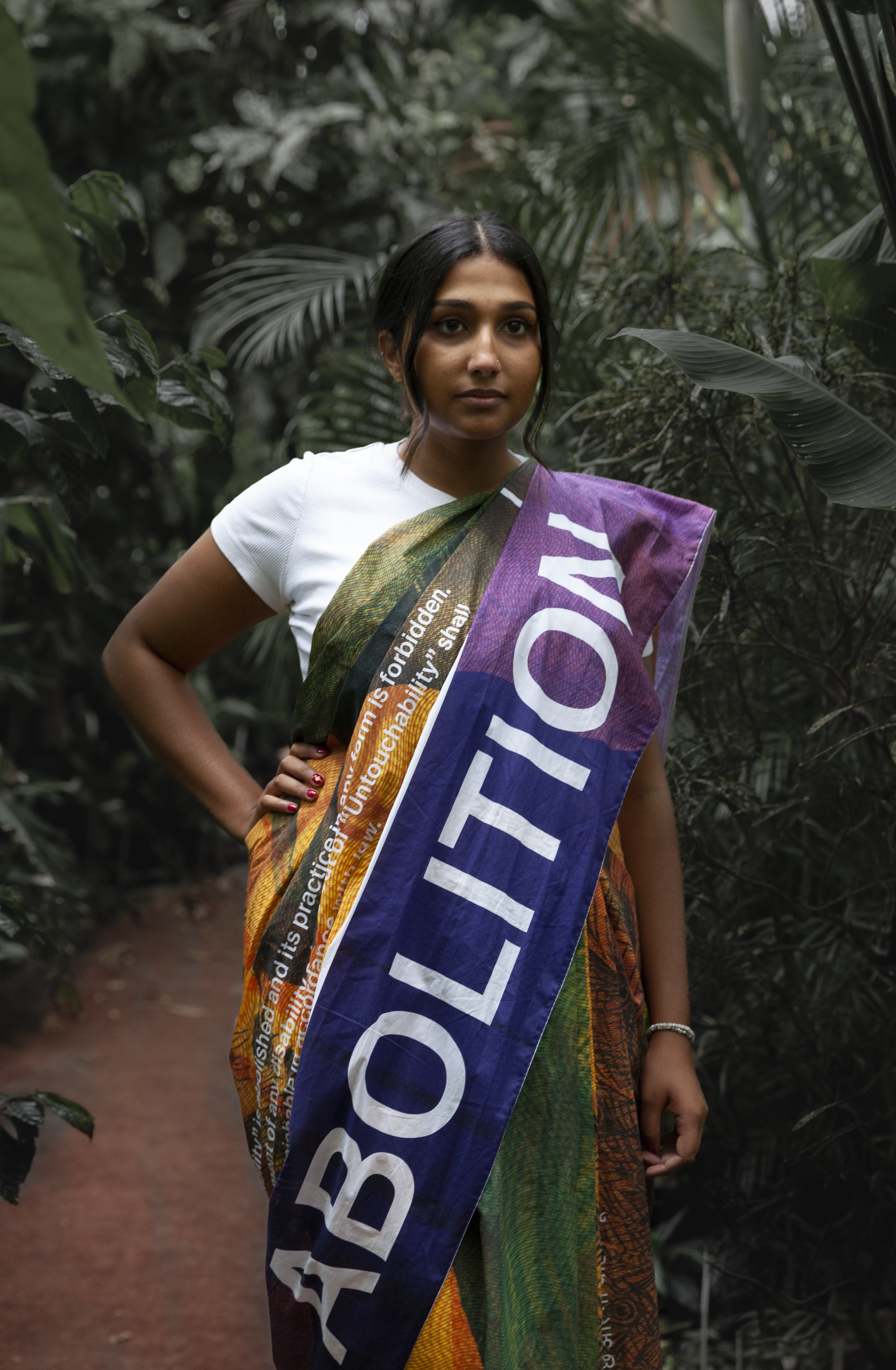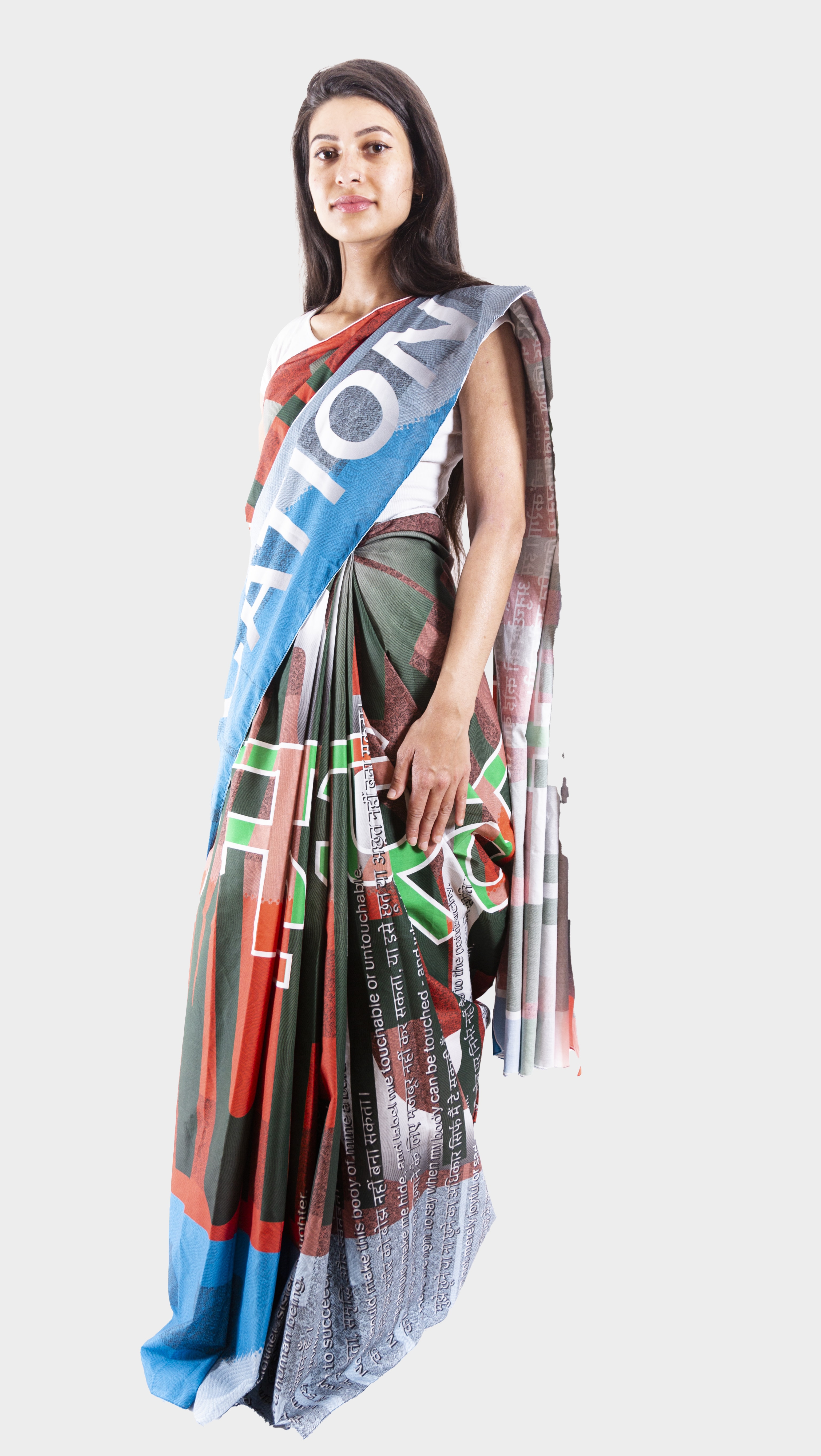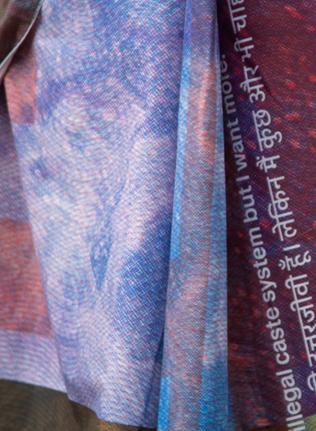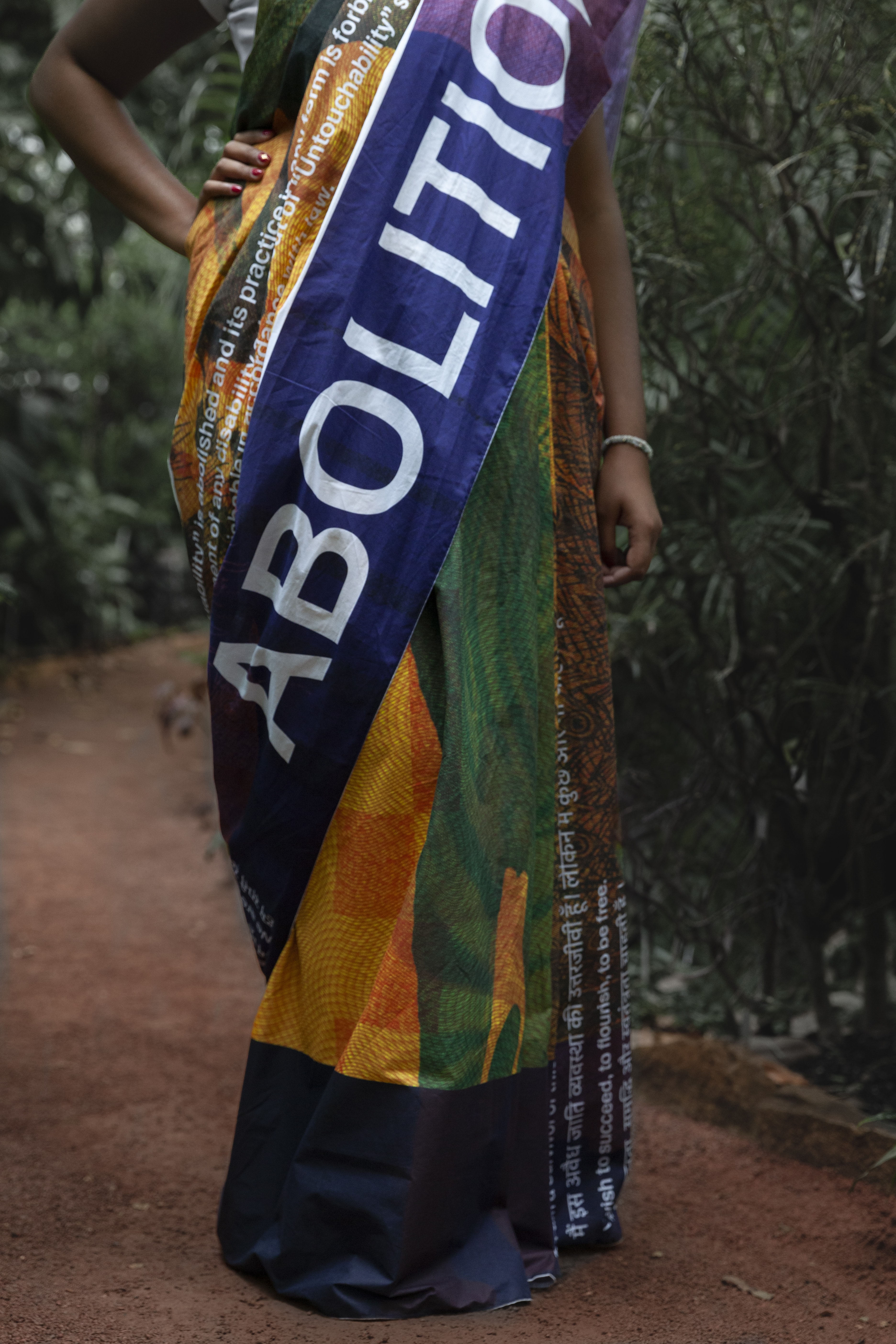 Although the caste system affects both men and women, as a designer I had to make a choice as to which of these to represent. Choosing the sari is my way of bringing the message to the people, and considering India is a male-dominated society in which gender bias is very present, empowering victims or survivors of the caste system and empowering women at the same time seemed like the right way to tackle the problem, in which the patriarchy plays a major part. In such a multilayered society women are at this vulnerable crossover point of both categories that are gender and caste, and although they are considered untouchable are still victims of rape. So empowering them through this piece of cloth felt like the right direction.