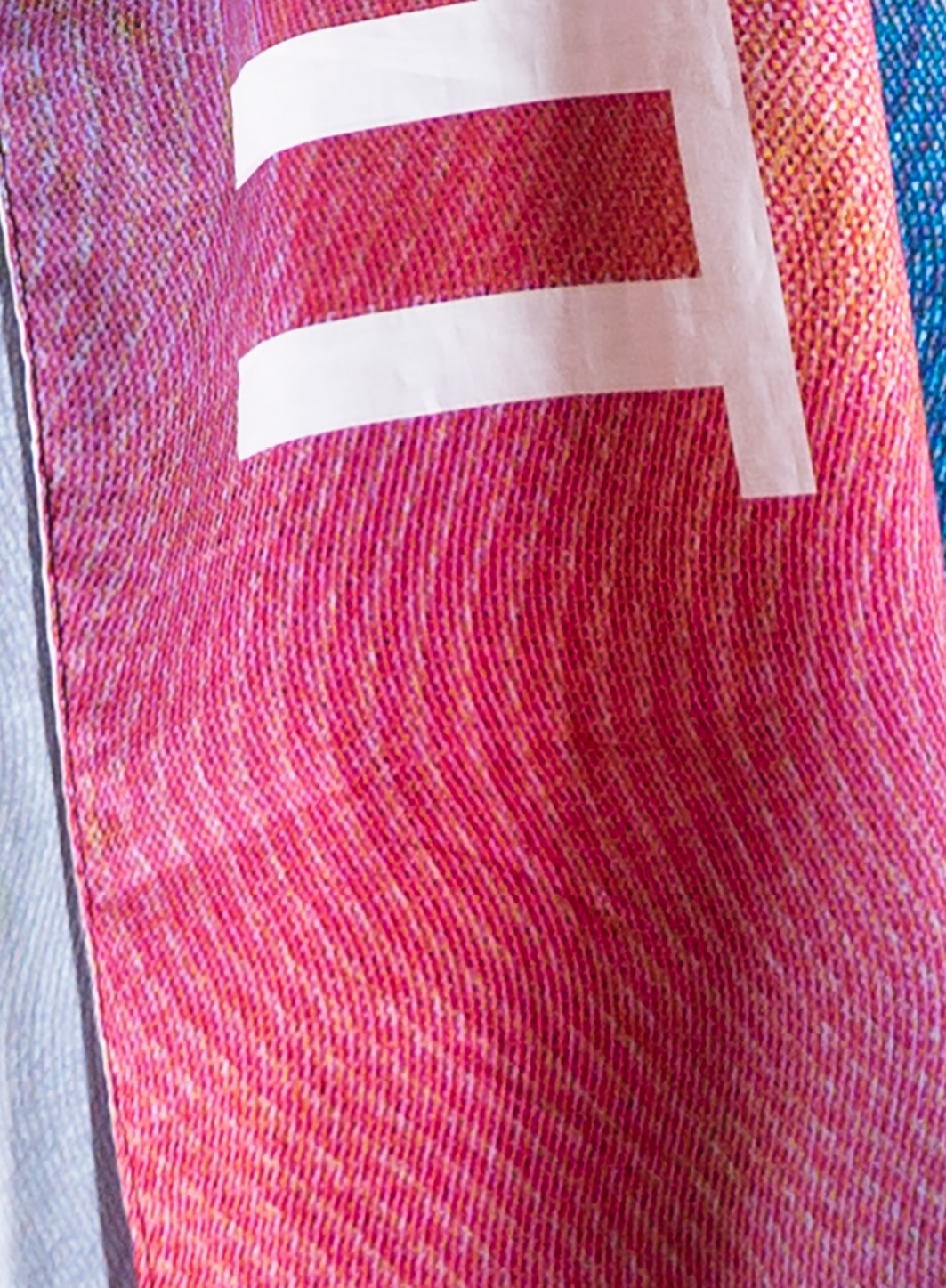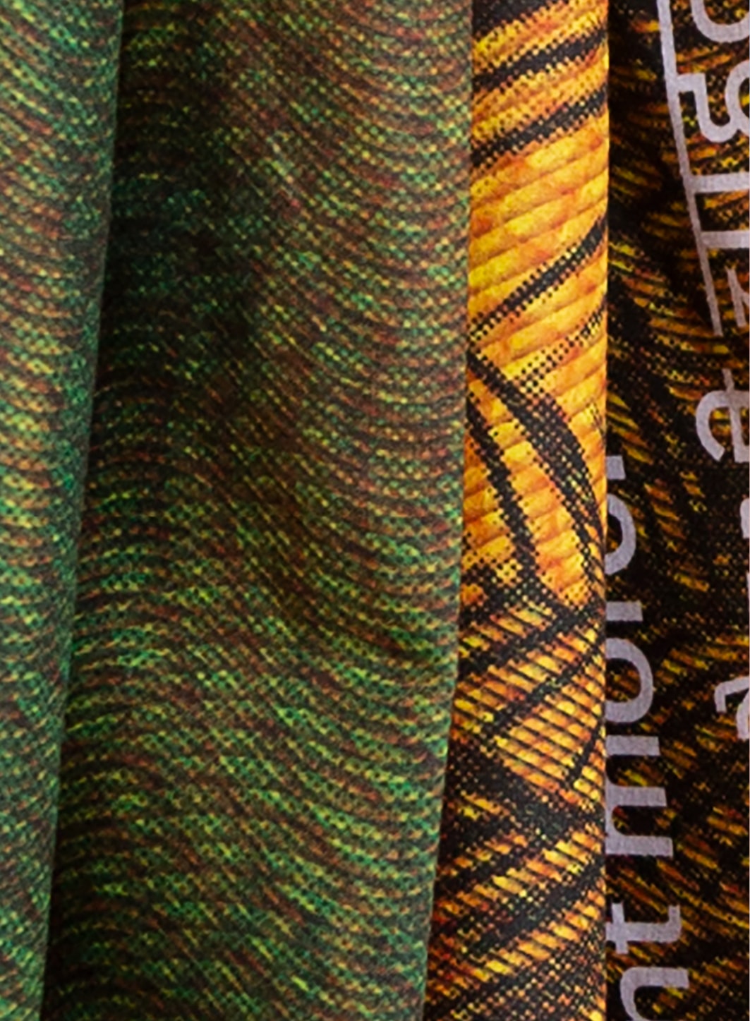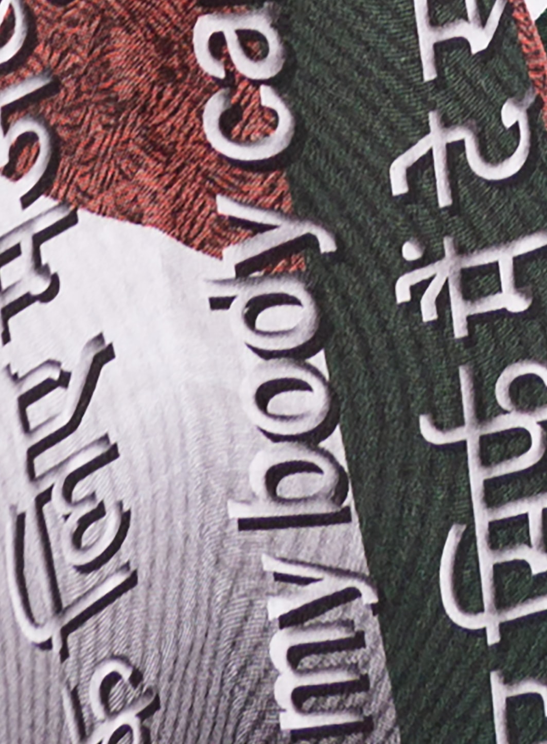 Finally for the process, here I will talk more from a technical stand-point as the stories about each piece are explained in the project descriptions. I had the constraint of a large format and the idea was to use images of elements that made a narrative sense. So there was firstly a pixelation issue as we are talking about 500cm × 115cm. So I decided to put all the images (that came in very poor sizes like 300 pixels of width) to a certain size and an unreasonable resolution (very high), accepting any form of pixelation as there was a processing plant. So first I made the images big, then I put them in bitmap mode with a sort of half tone processing which separated the images into dots and then gave each image their own monochromatic colour for meaning. From there the images lacked identity and also needed to be cohesive to be able to create a system for the whole collection. So there had to be a certain visual language translated systematically over the eight tissues. And also if I wanted the collection to grow I have reference points that preserve the identity of the project. So from there onwards, I created a custom halftone texture by designing crossing sinewaves — which are a very direct response to the issue of crossing cultures, sharing points of view and not discriminating but mixing, so this was a small message on a subtle level — that was absorbed into the bitmap texture of each image. Then on top of all the sarees was a layer of saree patterns in the form of squares or pixels with a little glitchy texture. Then to not have just flat spot colours on the background with these textured elements dropped over, as it felt very bland to the narrative, a whole wavy texture was added on the surface to bring all the elements together and henceforth all sarees became much more cohesive and part and parcel of a whole. Then what consolidated the whole structure and system of the collection was the typography structure. This is the final layer that puts the cement onto the system and defines the identity of the collection. I chose a neutral modernist typeface called "Continental" which worked very well for Latin characters and then a modernist sans serif (or non-calligraphic) Devanagari font for translations in Hindi. The two fonts needed to have the same or a similar level of contrasts typographically speaking. Given that India is such a big country and that there are so many languages spoken, English is the most spoken and then Hindi therefore I chose to put English first and then Hindi.