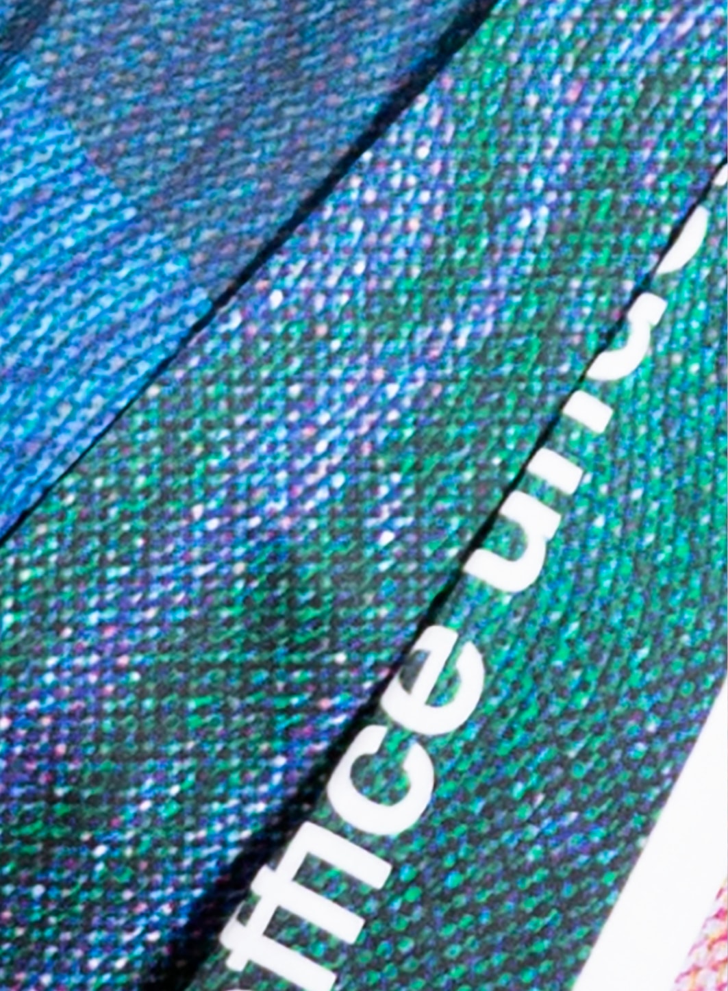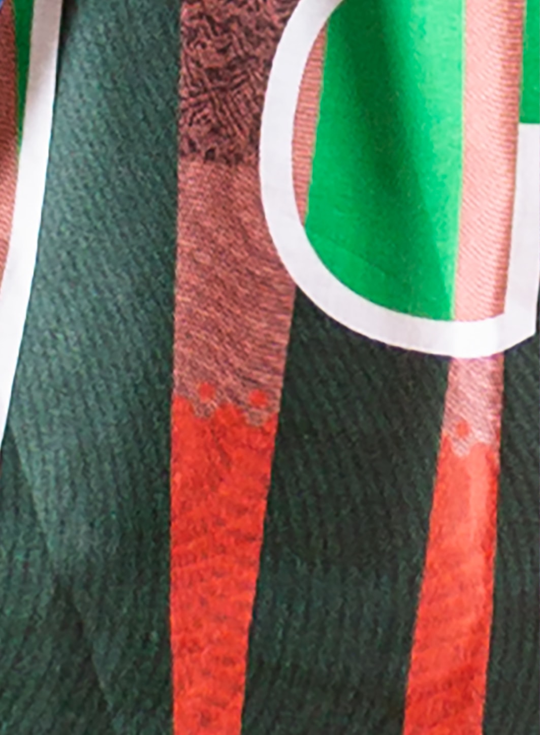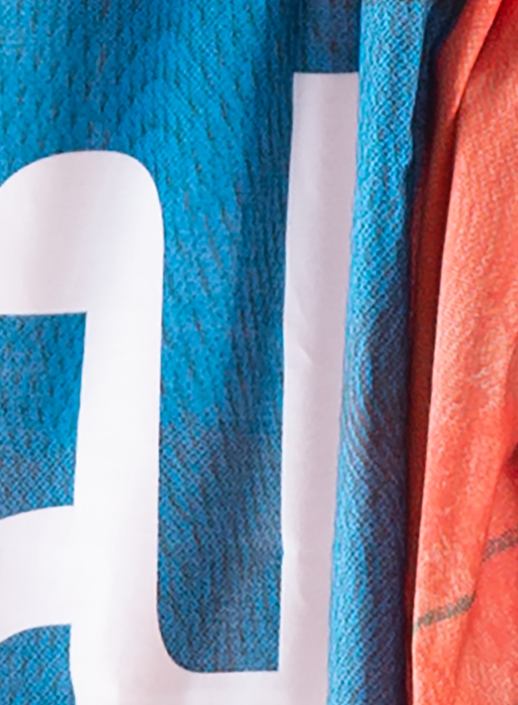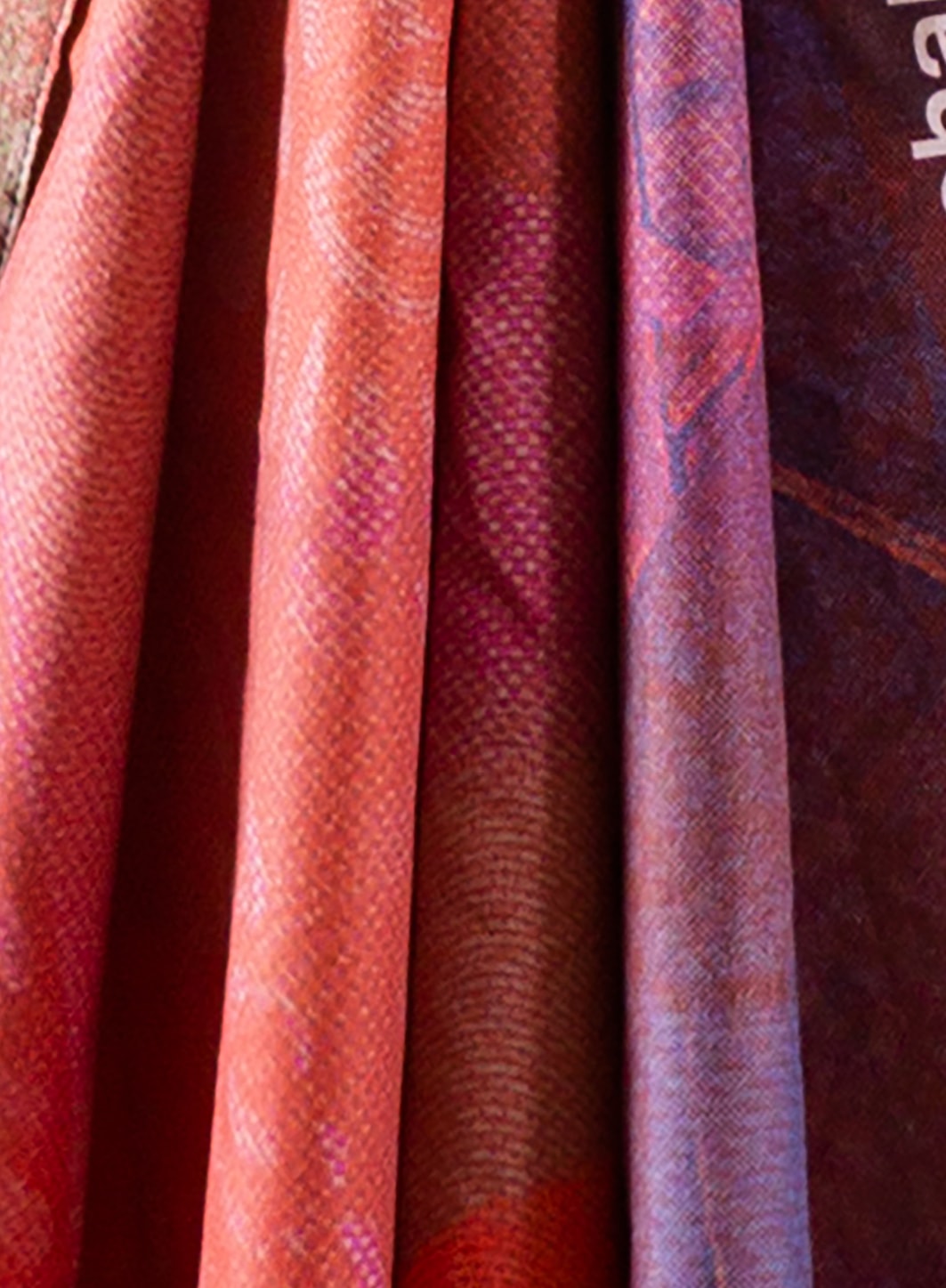 Finally for the process, here I will talk more from a technical stand-point as the stories about each piece are explained in the project descriptions. I had the constraint of a large format and the idea was to use images of elements that made a narrative sense. So there was firstly a pixelation issue as we are talking about 500cm × 115cm. So I decided to put all the images (that came in very poor sizes like 300 pixels of width) to a certain size and an unreasonable resolution (very high), accepting any form of pixelation as there was a processing plant. So first I made the images big, then I put them in bitmap mode with a sort of half tone processing which separated the images into dots and then gave each image their own monochromatic colour for meaning. From there the images lacked identity and also needed to be cohesive to be able to create a system for the whole collection. So there had to be a certain visual language translated systematically over the eight tissues. And also if I wanted the collection to grow I have reference points that preserve the identity of the project. So from there onwards, I created a custom halftone texture by designing crossing sinewaves — which are a very direct response to the issue of crossing cultures, sharing points of view and not discriminating but mixing, so this was a small message on a subtle level — that was absorbed into the bitmap texture of each image. Then on top of all the sarees was a layer of saree patterns in the form of squares or pixels with a little glitchy texture. Then to not have just flat spot colours on the background with these textured elements dropped over, as it felt very bland to the narrative, a whole wavy texture was added on the surface to bring all the elements together and henceforth all sarees became much more cohesive and part and parcel of a whole. Then what consolidated the whole structure and system of the collection was the typography structure. This is the final layer that puts the cement onto the system and defines the identity of the collection. I chose a neutral modernist typeface called "Continental" which worked very well for Latin characters and then a modernist sans serif (or non-calligraphic) Devanagari font for translations in Hindi. The two fonts needed to have the same or a similar level of contrasts typographically speaking. Given that India is such a big country and that there are so many languages spoken, English is the most spoken and then Hindi therefore I chose to put English first and then Hindi.