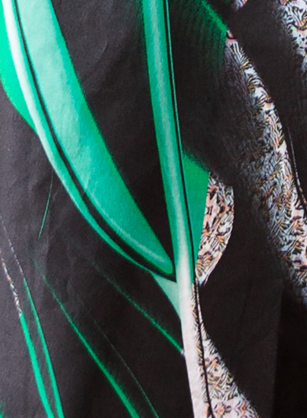 A sari is normally made from silk, cotton, or synthetic material with embroidery, silk screen prints or digital prints. Its length varies from 5 meters to 9 meters depending on the Indian state or type of sari you wear. On the sari, you will have three important sections on which to put the designs which are printed on one side only: the top and bottom borders (both being a full line going from one end to the other), to modernise the design; and the pallu at the end of the sari, which is the most expressive part and showcases most of the design. It covers approximately 30-40% of the sari so once wrapped around the person it shows on the front and back chest level. Under this piece of cloth woman wear a blouse similar to a crop top, and a petticoat which is like a long skirt covering the legs.