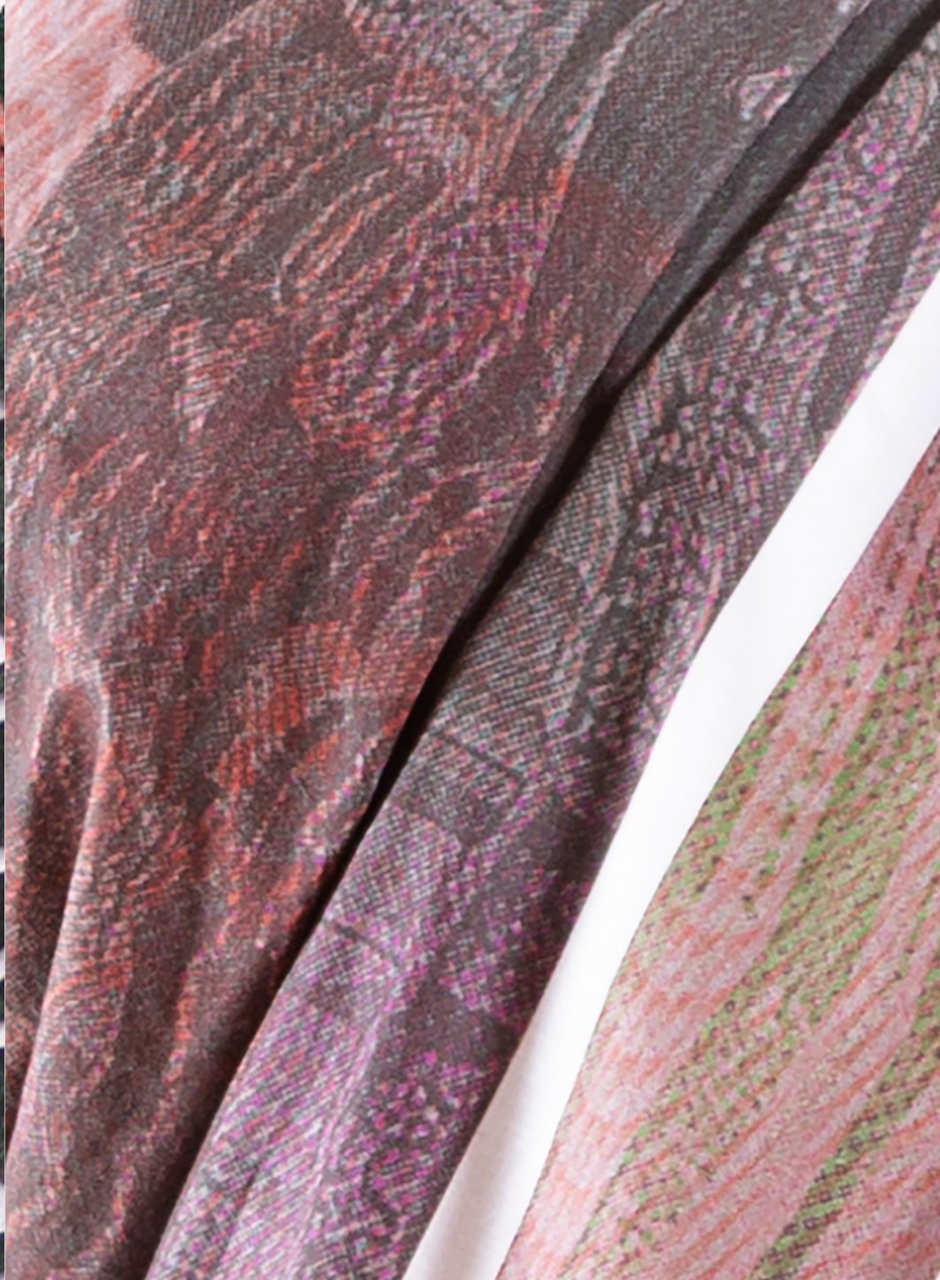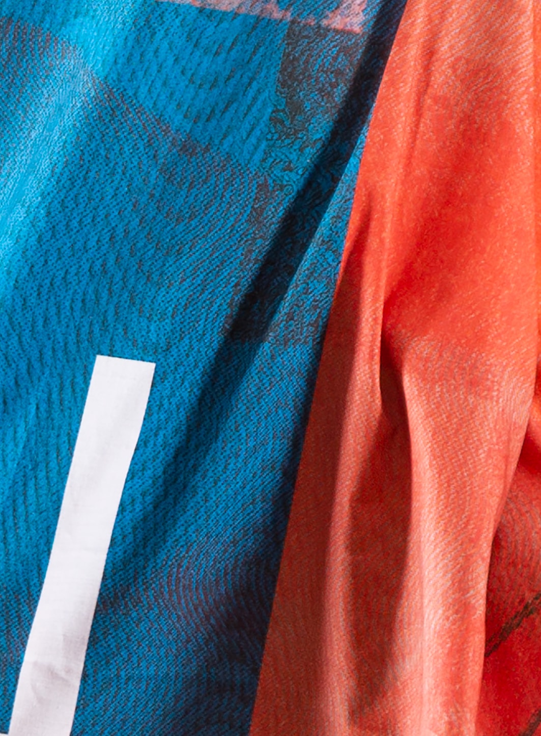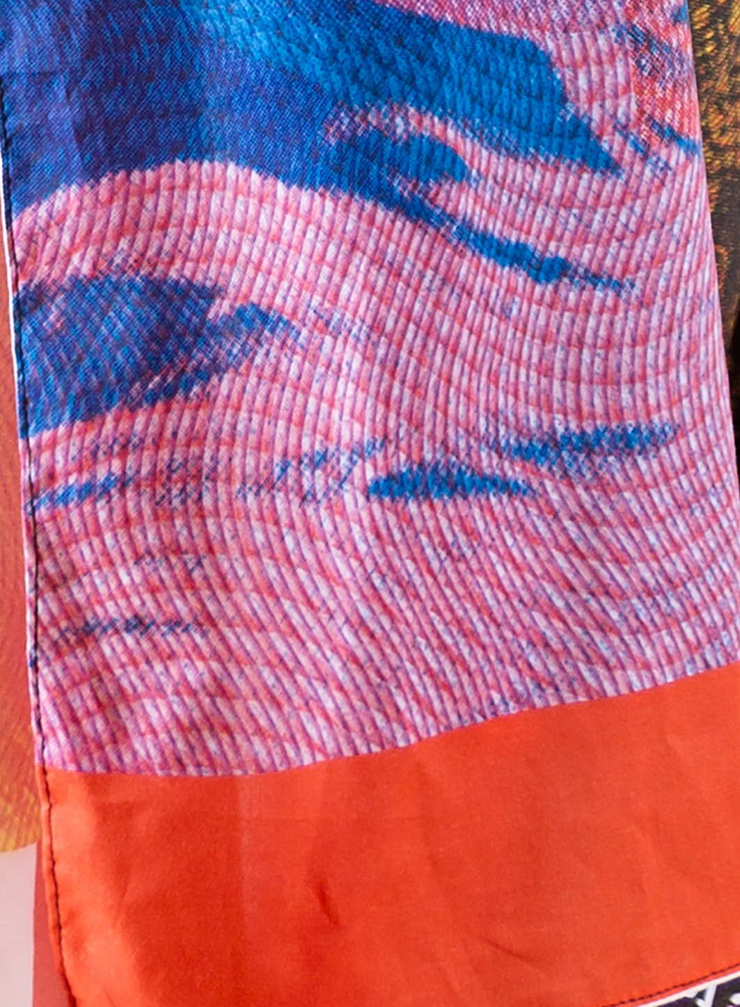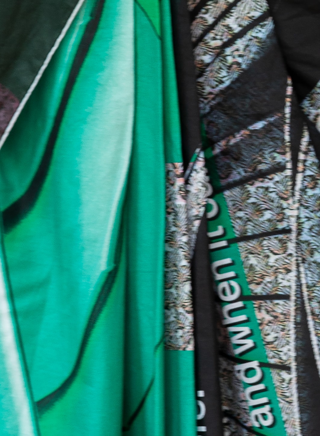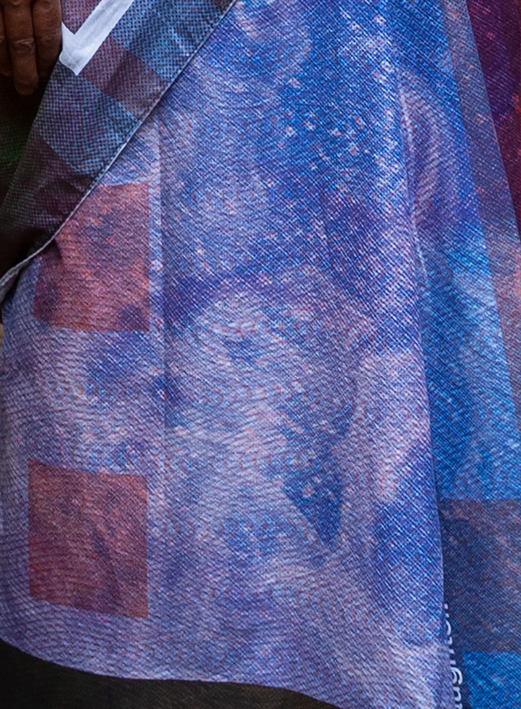 So the design process was very difficult at first, but the saree was the right choice because it is one of the only garments that transcend all socio-economical classes. A traditional garment that was worn 2000 years BC So worn by everybody in India, rich or poor, young or elderly, by all religions & from all states. So firstly, to find the right textile and process it was great because it is a strip of cloth so it generates minimal waste and minimal stitching. Silk, polyester, embroidery, silkscreen printing or digital printing are the main printing processes used. After discussion with some people in India about my design choices, digital printing was the way to go given the level of detail and complexity in the designs and also the budget. Not only for production but it was also thought through that every socio-economical class should be able to purchase such a saree. So I went for digital printing on "Cotton Voile (77g/m2)", this choice was made after multiple trials on different kinds of cotton with the precious advice of my mother who explained to me the reasons for which cotton would be most pragmatic for Indians to use. So this one was the best choice in the big realm of kinds of cotton that they had proposed to us because it is very light and nearly transparent if put through light. And the choice is that sarees should be comfortable mostly worn in South Asian countries, for this project India, with high temperatures so it has to be breathable and cooling. And the digital print renders very well on this light cotton. So the choice was right and tested.